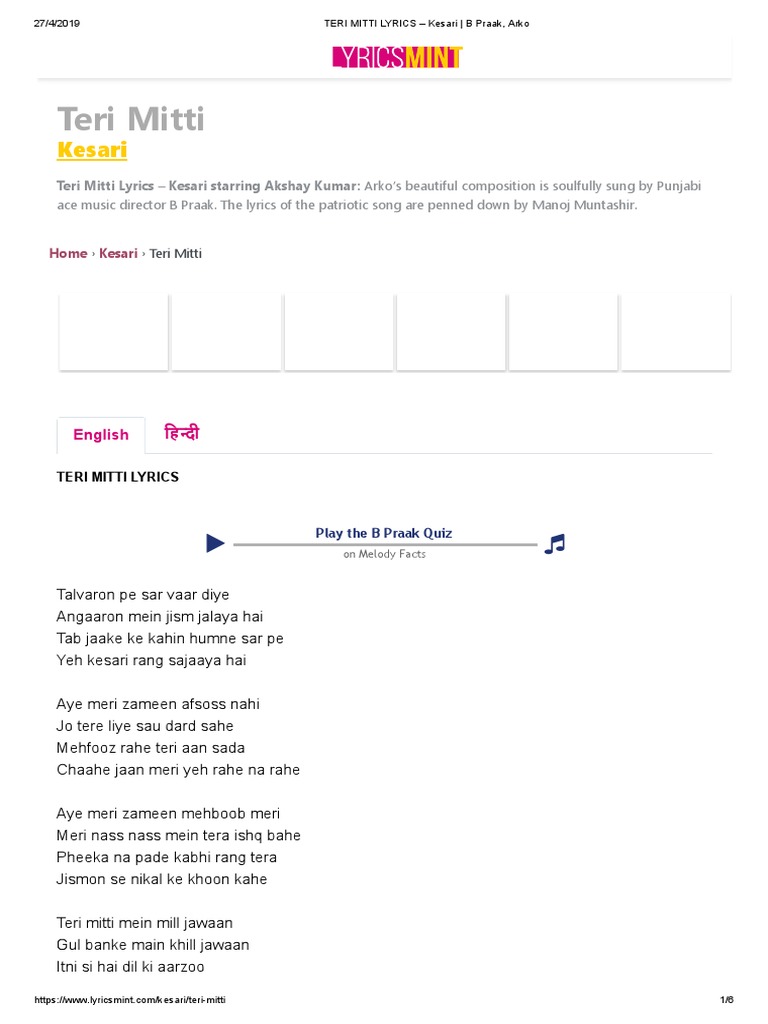 Tere Mitti Song Lyrics / The music labeled by zee music company.
