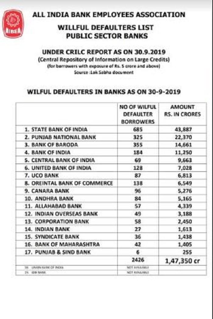 Top Wilful Defaulters Here Is The List Of 2 426 Who Together Owe Rs1 47 Lakh Crore To Public Sector Banks - Outstanding loans amounting to rs 68,607 crore of top 50 wilful bank loan defaulters in the country including firms of mehul choksi and vijay mallya have been technically written off till september 30, 2019, the reserve bank of india said in a rti reply to activist saket gokhale.